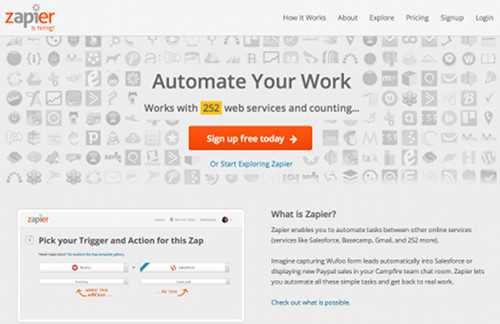 Zapier est une base de données proposant plus de 250 services Web. Zapier vous permet d’automatiser des tâches entre les autres services en ligne (Basecamp, Twitter, Paypal, Mailchimp, Gmail, etc.). Comme avec IFTTT, vous pouvez les combiner tous ensemble afin de vous libérer des tâches répétitives telles que l’envoi d’un email automatique, créer un document PDF avec des données provenant d’un certain service, ajouter un événement dans votre calendrier, et ainsi de suite.