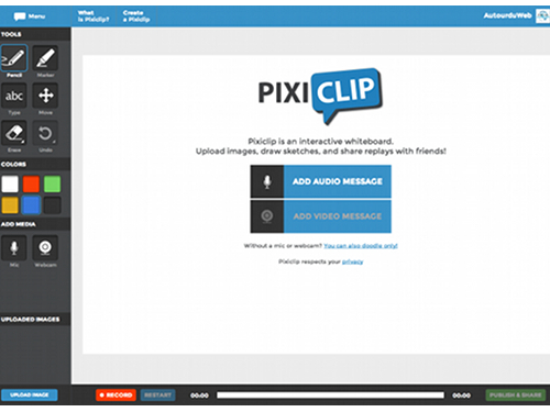 PixiClip est un service intuitif qui propose un tableau blanc interactif en ligne. Créer un message est une affaire de quelques minutes grâce à des outils pratiques. Vous pouvez l’utiliser pour présenter de l’audio, de la vidéo, une image ou du texte.